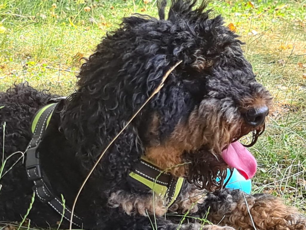 Der Papa Fernando ist ein Mittelpudel (Zuchtrüde, Ahnentafel, 44 cm Schulterhöhe, ca. 11 kg, Fellfarbe black and tan, Fellart: curly).
