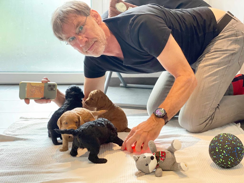 Inzwischen können sie sich immer besser auf ihren Beinchen bewegen und sie beginnen zu Bellen oder zu Knurren. Die Welpen nuckeln nicht nur an Bonnies Zitzen, sondern schlecken sich gegenseitig ab, um zu sehen wir die Geschwister oder auch Bonnies Frauchen und Herrchen schmecken.