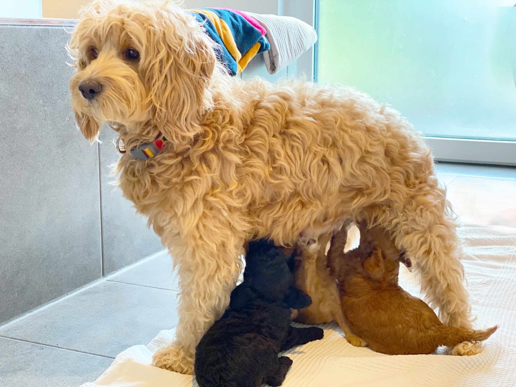 Die Welpen werden immer häufiger im Sitzen oder auch im Stehen gesäugt und müssen nun kräftig „arbeiten“ um an die Milch zu kommen.