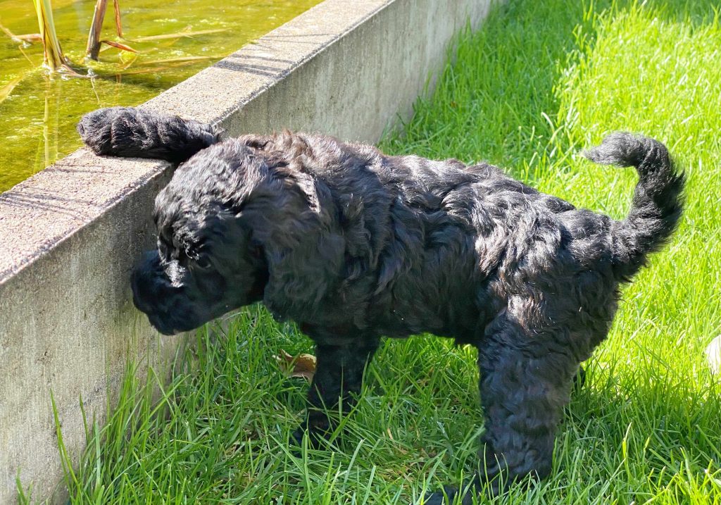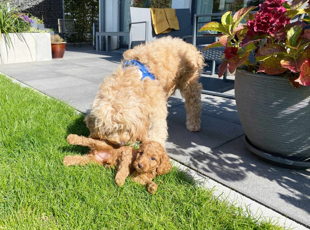 Unsere Welpen machen immer mehr neue Erfahrungen. Bei sonnigem Wetter durften sie gestern gleich 2 Ausflüge in unseren Garten machen.