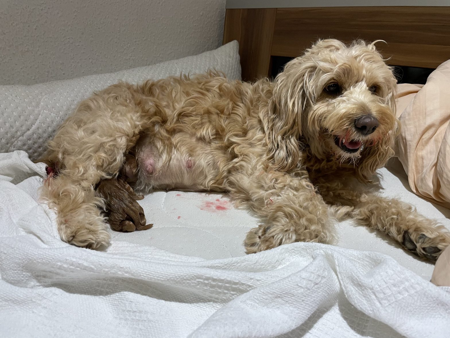 Als Geburtstermin hatte der Tierarzt den 22. August 2022 errechnet. Den Tag verbrachten Bonnie und ich mehr oder weniger gemeinsam im „Wurfbett“. Immer wieder wurde sie unruhig, scharrte sich ein Nest zusammen, hechelte verstärkt. Wir nahmen an, dass die Geburt bald einsetzen würde, doch bis zum frühen Abend war nichts weiter passiert.