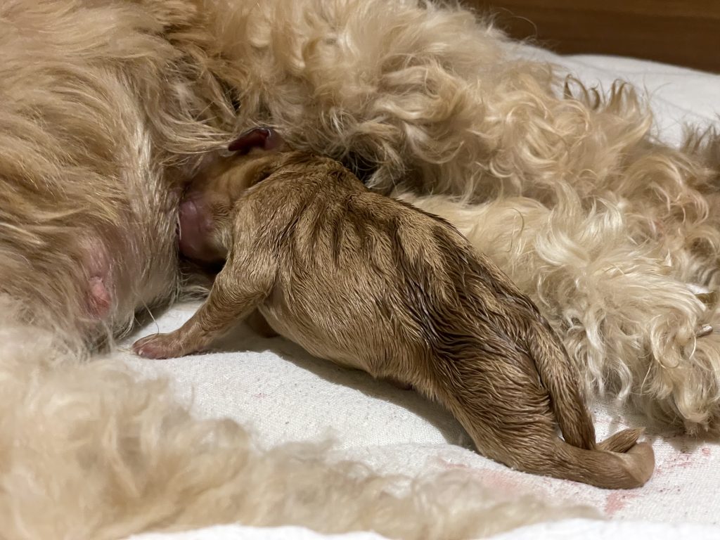 Um 19:15 Uhr wurde das 1. Mädchen (Apricot) geboren. Instinktsicher öffnete Bonnie die Fruchtblase, biss die Nabelschnur durch und säuberte das Kleine. Beim Finden der Zitze und ersten Saugen mussten wir ein bisschen helfen, aber dann lief alles wie von selbst.