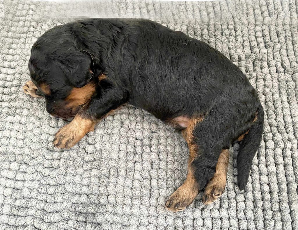 der letzte und schwerste Welpe – Rüde black and tan – ganz der Papa