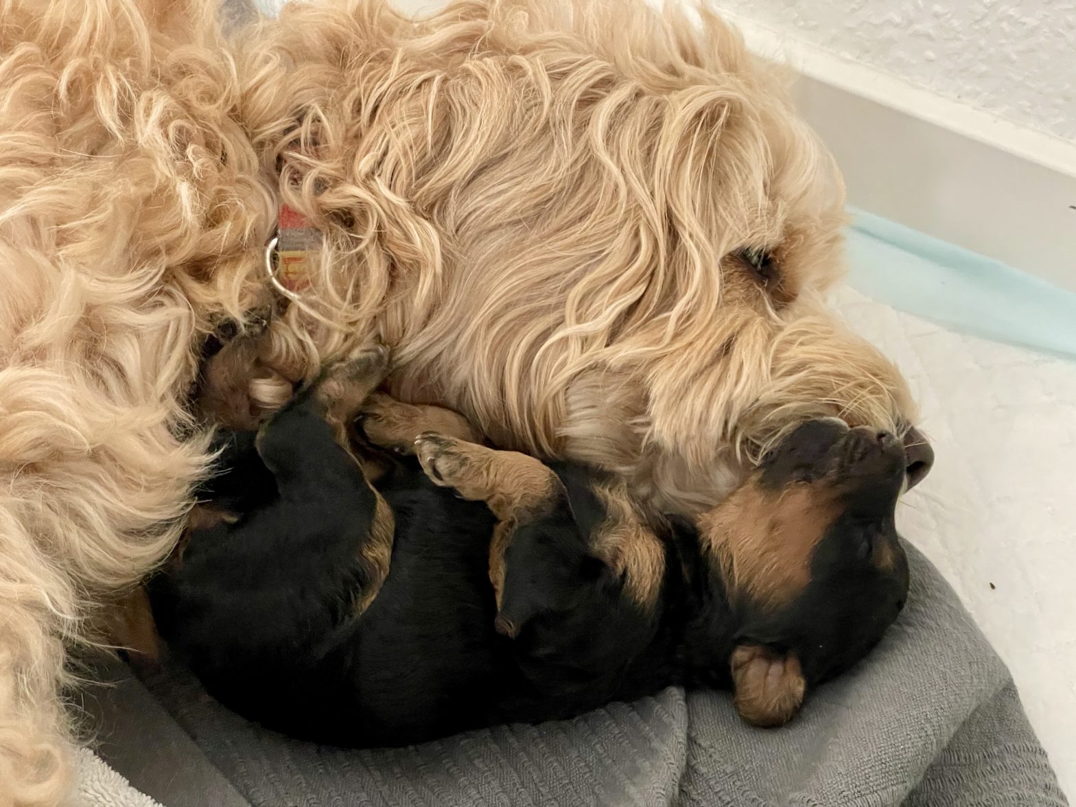 Nun sind die 4 Cockerpoo Welpen schon eine Woche alt und haben schon so einiges erlebt. Sie werden ja blind und taub geboren und können noch nicht viel. Aber ihr Geruchssinn funktioniert schon sehr gut und sie können sich auch schon fortbewegen und so ihre Mama Bonnie zunächst „erschnüffeln“ und dann kriechend erreichen. Die Wurfkiste hat ungefähr 1 qm, so dass alle genügend Platz haben, ohne zu weit voneinander entfernt zu sein. Wenn sie Hunger haben fangen sie an zu „mauzen“ und Mama Bonnie reagiert sofort. Dasselbe passiert, wenn es im Bäuchlein drückt, dann leckt Bonnie die Kleinen so lange, bis sie sich erleichtert haben.